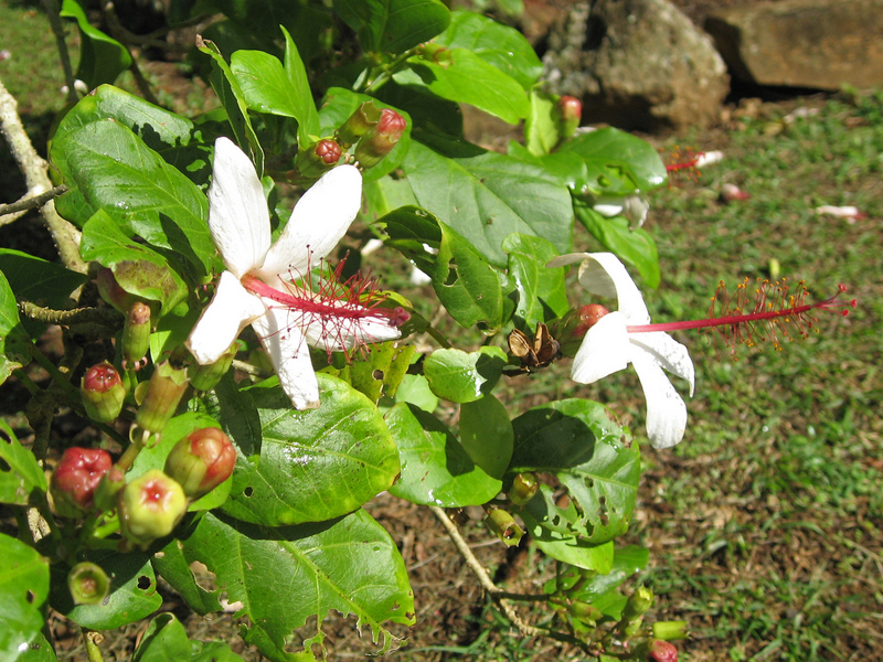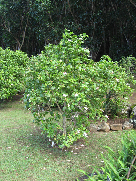A member of the Mallow family (Malvaceae), Hibiscus waimeae subspecies hannerae (Koki'o ke'oke'o in Hawaiian) is a small, gray-barked tree up to 10 m tall. The upper surface of the leaves is light green while the lower surface is covered with velvety hairs which makes it appear grayish. The round or oval leaves are 5-20 cm long and 2 to 13 cm wide. The single flowers last only one day. They are white when they open in the morning and they fade to pink in the afternoon. The flowers occur towards the ends of the branches and have a strong, sweet fragrance, which is rare in the Mallow family. The staminal column is pink to crimson. The seeds of Hibiscus waimeae are contained in tough, oval capsules about 2 cm long. The fuzzy brown seeds are about 5 mm long. Hibiscus waimeae subsp. hannerae is easily grown from fresh seed, but Hawaiian hibiscus hybridize readily and seedlings may be very different from the parent plants. Of the two subspecies, Hibiscus waimeae subsp. hannerae has larger leaves, but smaller flowers than that of H. waimeae subsp. waimeae. (Wagner,W.L., D.R. Herbst, and S.H. Sohmer. 1990. Manual of the Flowering Plants of Hawaii.)(NTBG. 1992. Unpublished Internal Papers.)(Rauch. 1997.)