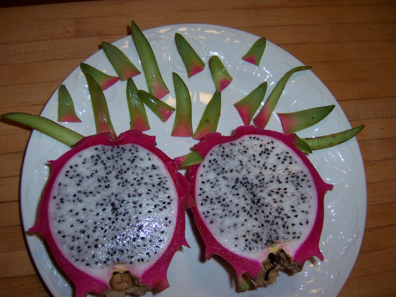 The fruit of many Hylocereus species, including H. undatus, is edible and is known by the common name pitaya or strawberry pear. The fruit has a very refreshing flavor and is slightly sweet. Hylocereaes undatus is a fruit that can be eaten out of hand. It can also be used to make wine, be put in smoothies, or make pastries. The taste is somewhat bland considering the elaborate skin the fruit has. To eat a dragonfruit out of hand, the easiest way is to slice the fruit in half, and simply scoop the flesh out with a spoon. Dragonfruit is a good source of calcium, fiber, and vitamin C that is low in calories. In south China the flowers are cooked and eaten in a soup that is made with ham.