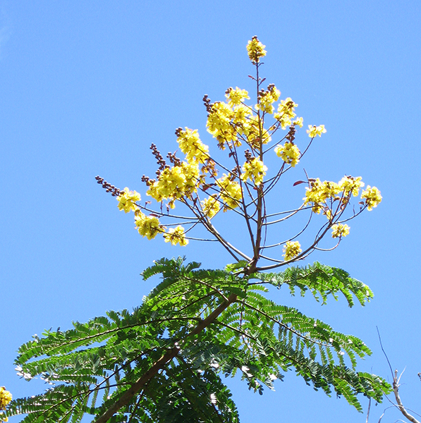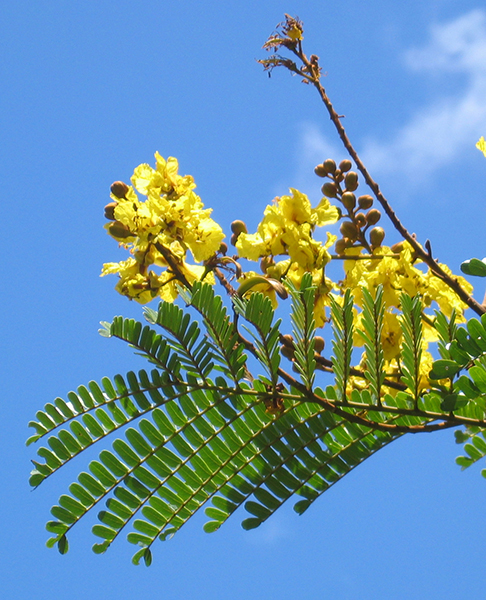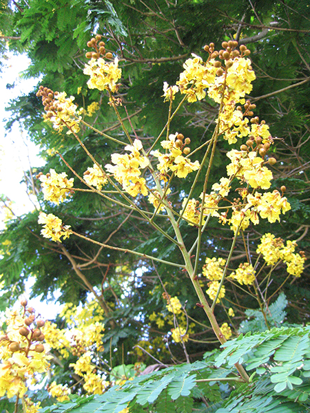 Yellow Poinciana is a very showy flowering tree up to 50' tall, with wide-spreading branches that form an umbrella-like crown up to 25' across. The stems and twigs are rusty-red tomentose. The leaves are bipinnate (twice compound), about 2' long with 8-20 pairs of 3/4"-long oblong leaflets. The fragrant flowers are clustered on upright stems about 18" long. Each flower is about an inch and a half across with translucent yellow, crinkled petals. The flowers have conspicuous orange stamens and each petal has a reddish brown mark in the center. They are followed by purplish brown, flattened, oblong seed pods, 3-4" long, which remain on the tree until the next flowering season.