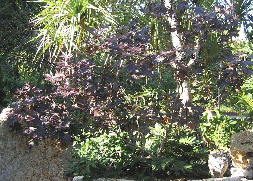 Castor Bean has escaped cultivation and established in waste areas, the edges of cultivated fields, canal banks, etc., in South Florida, but it has not become a serious pest weed. It is, however, listed as a Category II Species - has the potential to disrupt native plant communities - by the Florida Exotic Pest Plant Council.