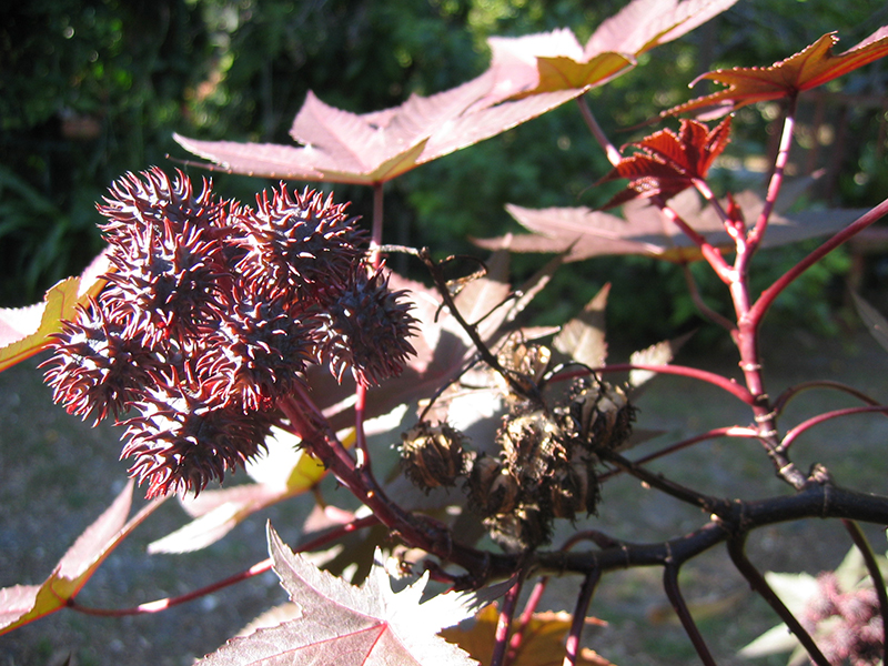 The seeds from the Castor Bean plant, Ricinus communis, are poisonous to people, animals and insects. One of the main toxic proteins is "ricin", named by Stillmark in 1888 when he tested the beans' extract on red blood cells. If the seed is swallowed without chewing, and there is no damage to the seed coat, it will most likely pass harmlessly through the digestive tract. However, if it is chewed or broken and then swallowed, the ricin toxin will be absorbed by the intestines. It is said that just one seed can kill a child. Children are more sensitive than adults to fluid loss due to vomiting and diarrhea, and can quickly become severely dehydrated and die. Perhaps just one milligram of ricin can kill an adult.