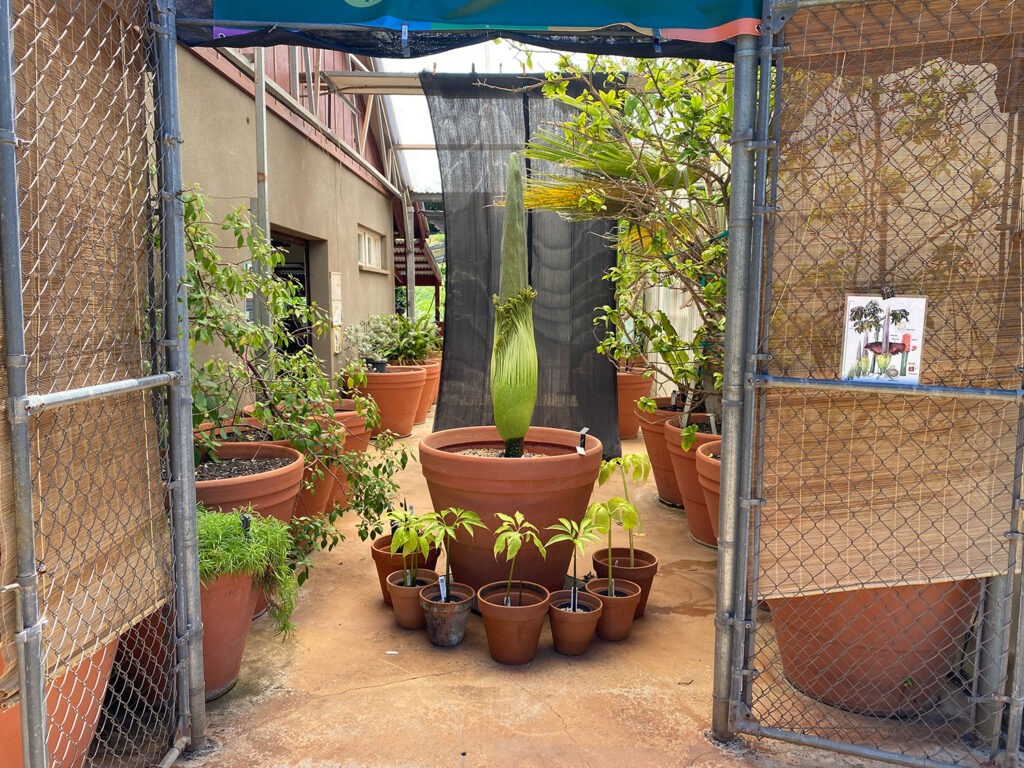 One of the biggest botanical spectacles is unfolding at NTBG: the blooming of the famed corpse flower (Amorphophallus titanum). Our staff have named the plant Pua Pilo, Hawaiian for “stinky flower,” an homage to the putrid scent the species uses to attract its pollinators. Our Conservation Nursery has been lovingly caring for Pua Pilo for over six years and they’ve confirmed its latest growth is forming the signature bloom!