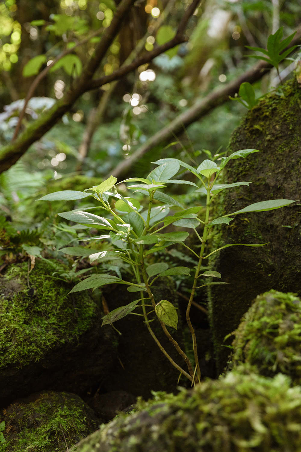 Recognized around the world as a house plant, the octopus tree (Heptapleurum actinophyllum) is a highly-invasive tree in Hawai‘i (photo 1). Clidemia (Miconia crenata), is an invasive shrub that forms a dense understory on the forest floor, choking out other plants (photo 2). Miconia’s long lasting fruits and seeds are dispersed by birds, wild boar, and other animals, hastening its spread. By removing invasive plants like these, Hawaiian plants like māmaki (Pipturus kauaiensis) and Polynesian-introduced kukui (Aleurites moluccanus ) can thrive and create shade for low to midstory out-plantings.