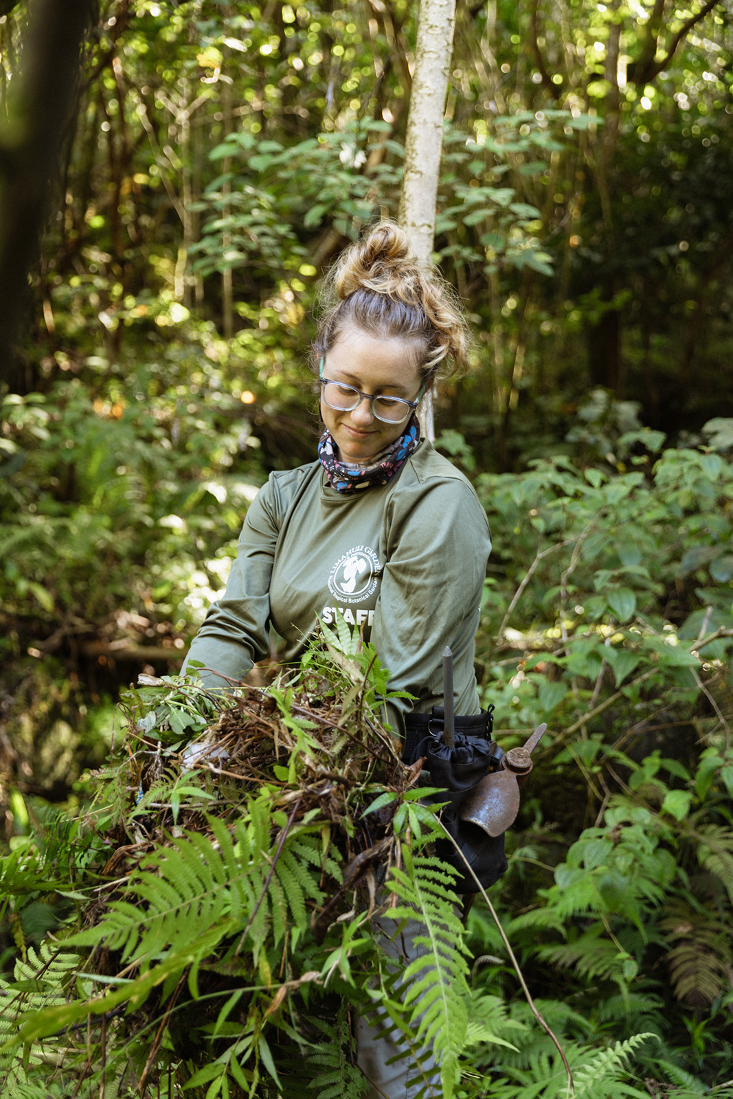 Crew member Uma plants young neke ferns (Cyclosorus interruptus) which can form a dense ground cover allowing natives to thrive in wet, muddy areas instead of more aggressive weeds (photo 1). As they form a thicket, they stabilize and protect the streambanks from erosion. Crew member Fran carries potted mau‘u (Carex wahuensis), a native sedge NTBG frequently used for restorations because it is hardy, versatile, and grows well along streams as well as drier areas (photo 2).
