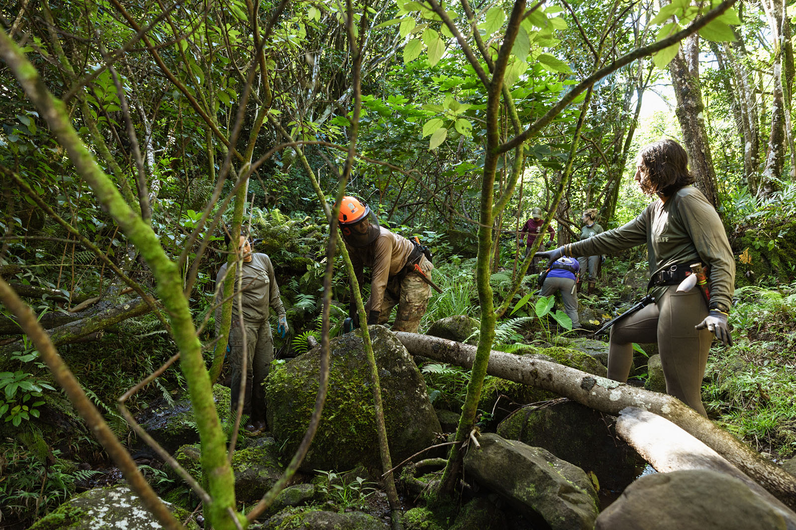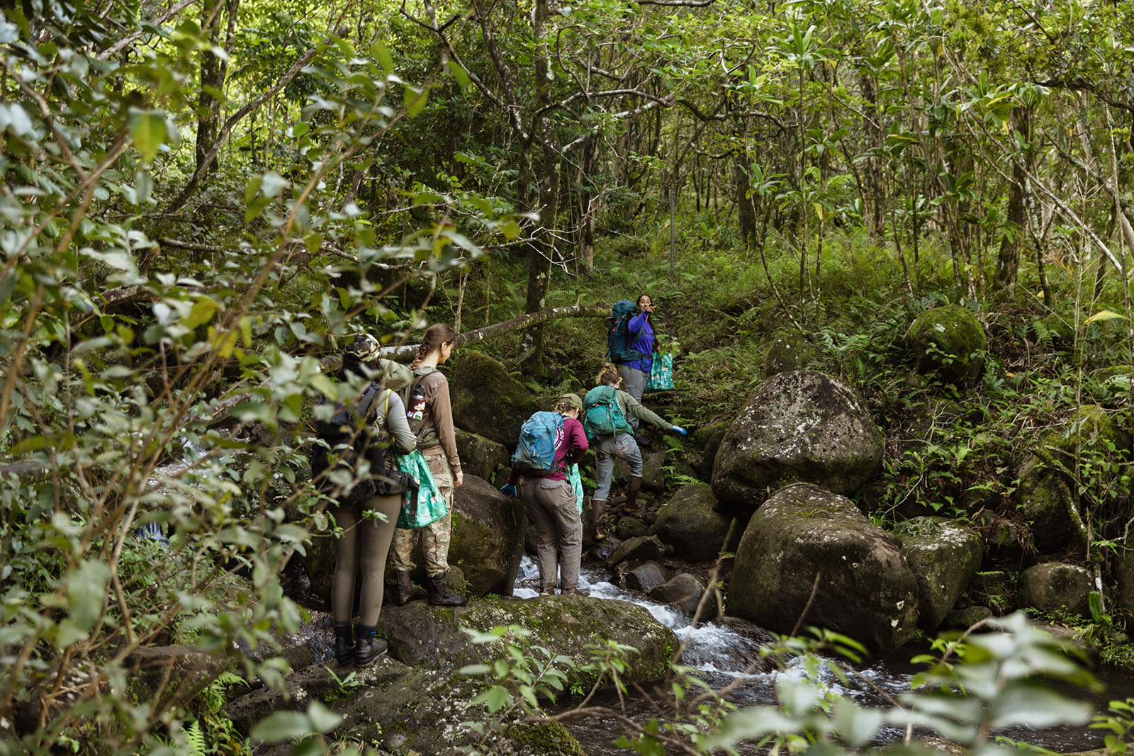 Building on decades of experience in the specialized care of endangered species and ecosystem restoration—all through a biocultural lens that focuses on the bonds between plants and people —we are beginning the restoration of a new area in the Lower Limahuli Preserve. In December, with the generous support of LORE Fragrances, our team launched an intensive, targeted restoration of a 250-foot section of a key tributary that feeds the main stream.