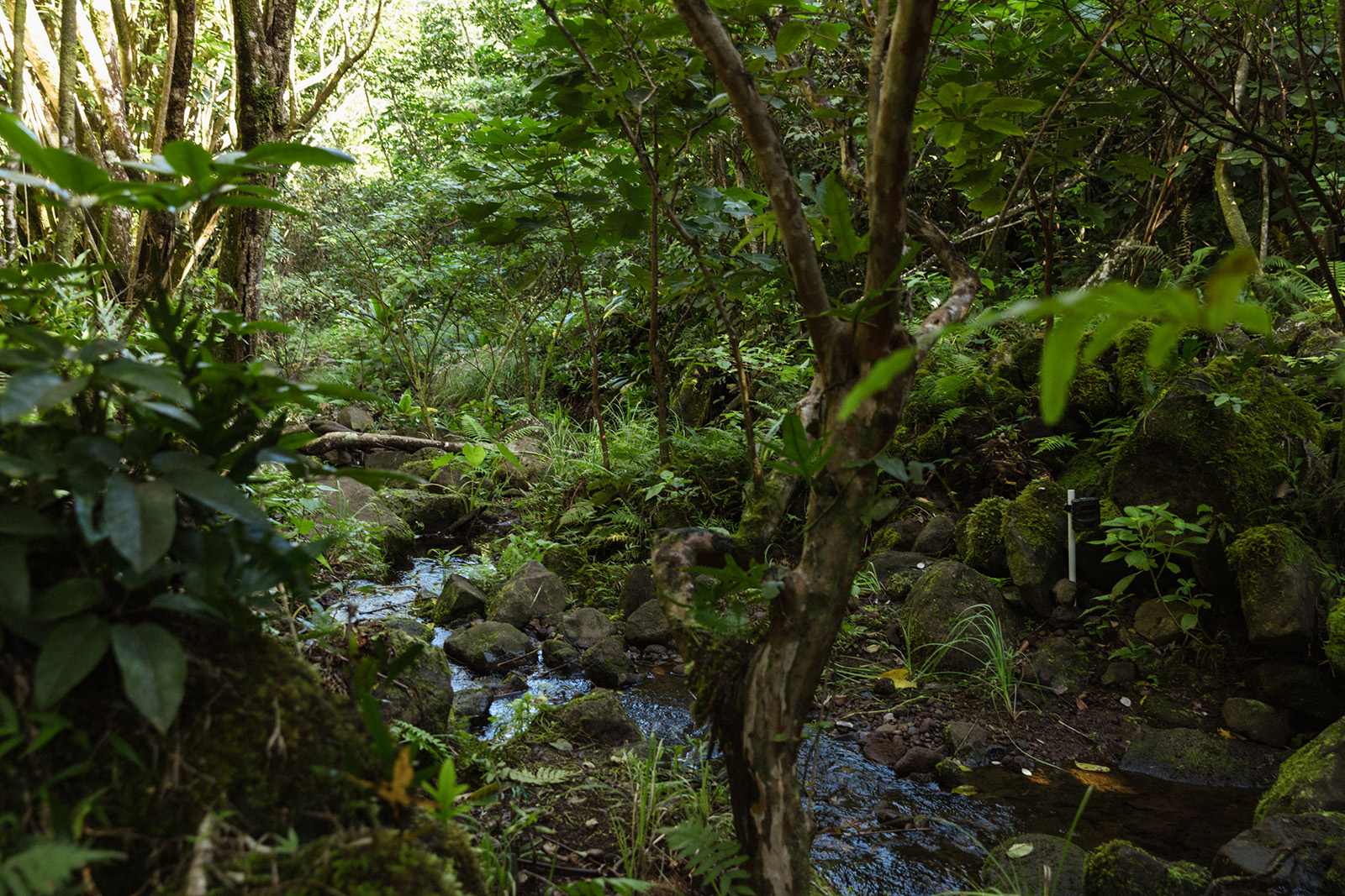 A general overview of the restoration area showing a tributary to Limahuli Stream that has been previously cleared and replanted with māmaki and ha‘iwale are starting to establish themselves. Remotely operated cameras allow the crew to take timed photos for monitoring progress and change over time.