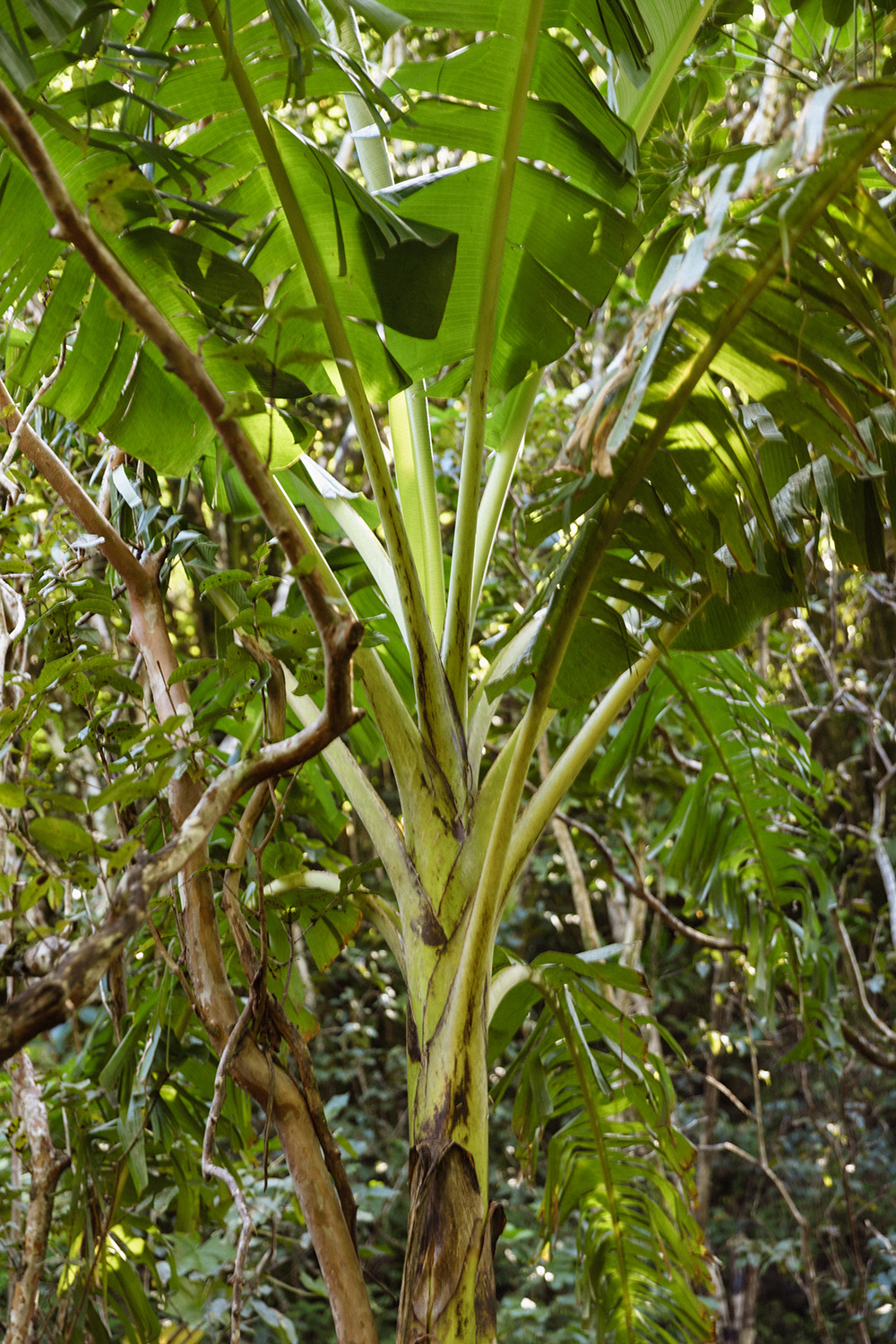 A staff member holds laua‘e o makana (photo 1). This native fern known scientifcally as Microsorum spectrum holds special meaning in Hāʻena in chants, stories, and cultural identity. This versatile fern can grow epiphytically on rocks and in soil and is so deeply connected to Hā‘ena that its name is also used to refer to the people of this place. Ha‘iwale (Cyrtandra wainihaensis), both endangered and endemic to Hawai‘i, is one of the focal species the team is outplanting in this area (photo 2). These plants come from seeds collected deeper in Limahuli Valley and will hopefully thrive in this restoration site which is similar to the habitat where the seeds were collected. Mai‘a (Musa sp.) are wild growing bananas that can be found throughout Limahuli Valley (photo 3). This Polynesian introduced crop has been growing in the valley for many generations. As a familiar food plant, mai‘a is a reminder of the important relationship between people and plants. Preserving these wild mai‘a is an effective way to perpetuate the heritage of the valley.