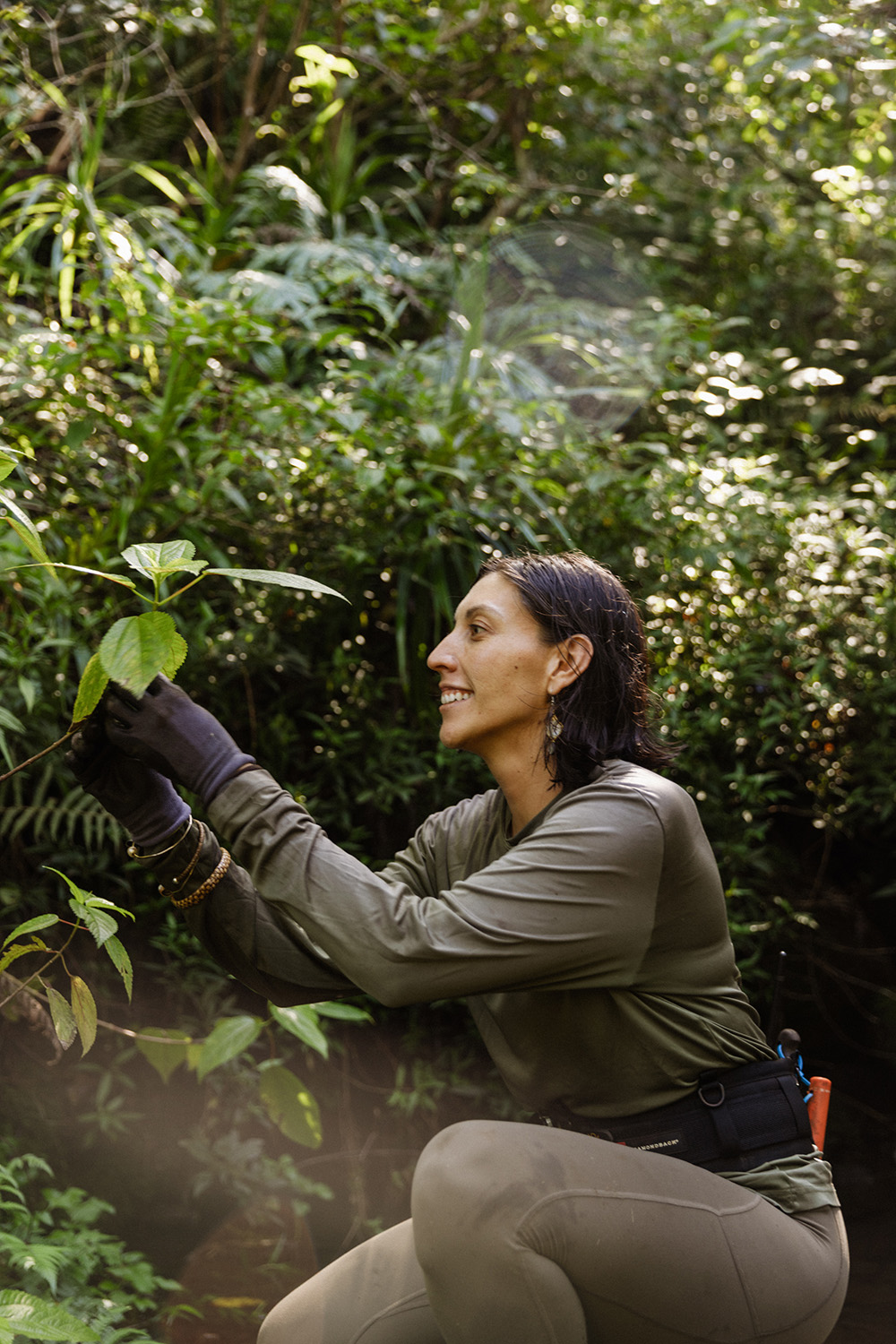 A member of the crew makes her way through a stand of hala (Pandanus tectorius), a native tree important for both ecological and cultural roles. Hala is used throughout the Pacific for weaving. In restoration, hala plays a positive role in disturbed areas or along steep slopes which are difficult to restore. Located near an archaeological site in the preserve, hala is a physical reminder of the deep connection between people, place, and plants.