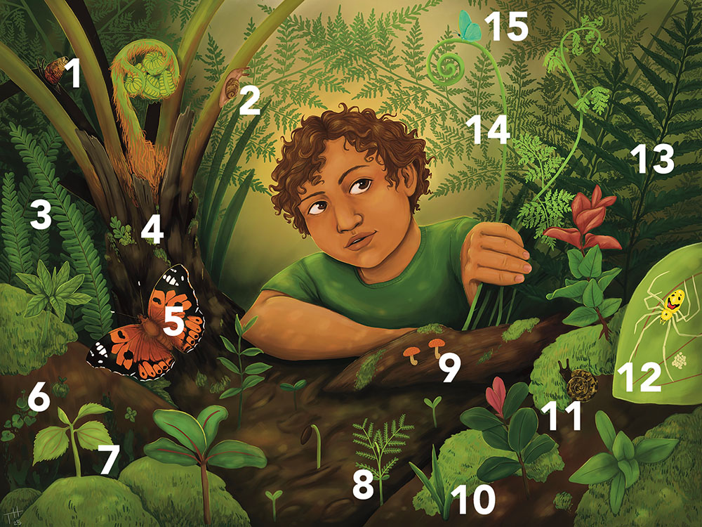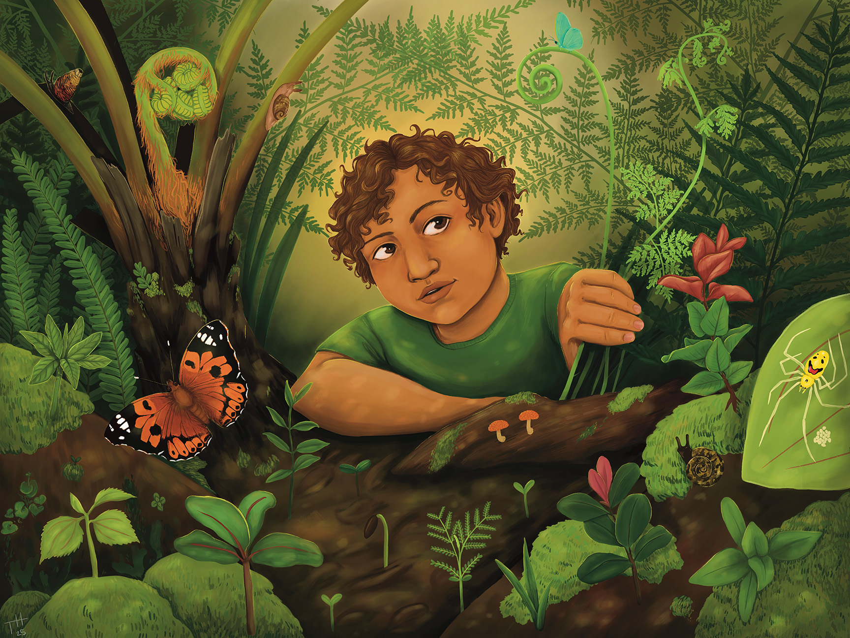 “This piece was inspired by this year’s theme- Kupu: offspring; upstart; to sprout, grow, germinate, or increase. My work as a botany graduate student focuses on seedling ecology and the relationships between seedlings and native understory ferns,” says Tressa. “When I think of growth, of course I think of seedlings and all of the multitude of small growing things to be found on the forest floor. I also think of keiki- children, and their curiosity; their ability to see and find things we miss.”